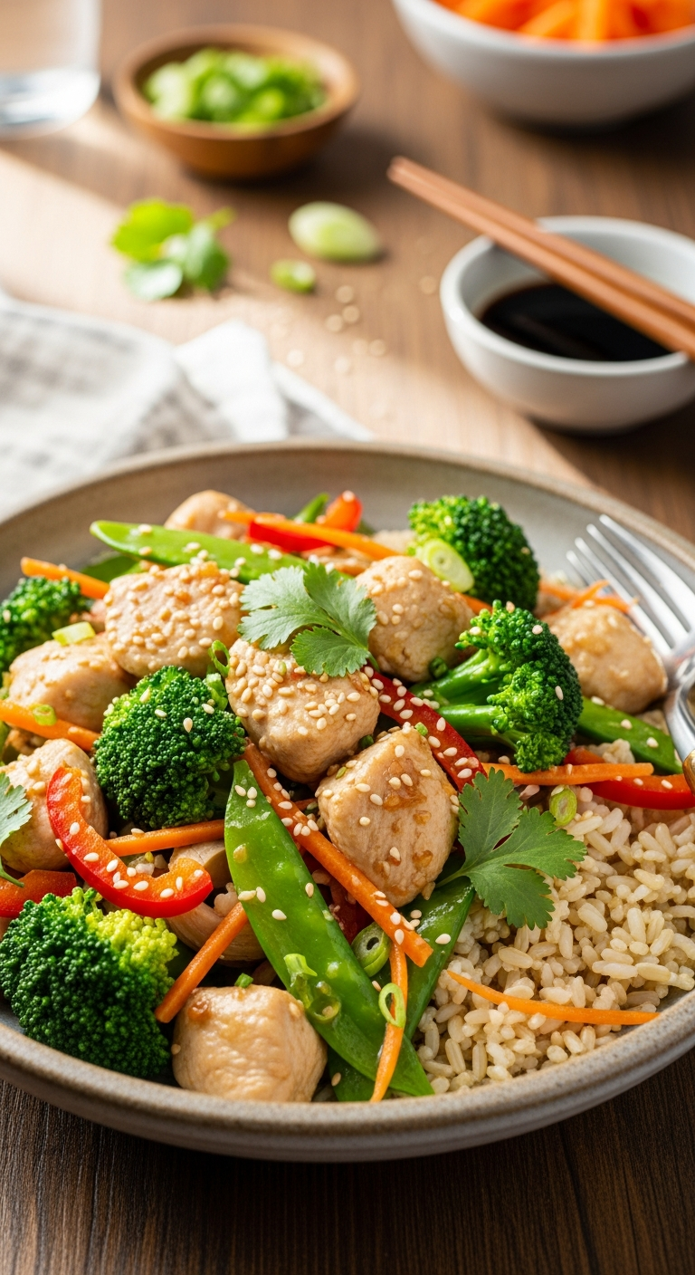 A1: This stir-fry balances lean protein from chicken breast, nutrient-rich broccoli packed with vitamins and fiber, and whole grain brown rice that adds sustained energy with its complex carbohydrates. It’s low in unhealthy fats and high in essential nutrients, making it a light yet satisfying dish perfect for a nutritious meal.